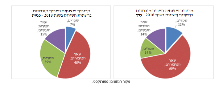 משרד החקלאות: בשנת 2018 סך המכר של הפיצוחים והפירות המיובשים ברשתות השיווק הגיע לכ-12,000 טון, בערך של כ-600 מיליון ₪