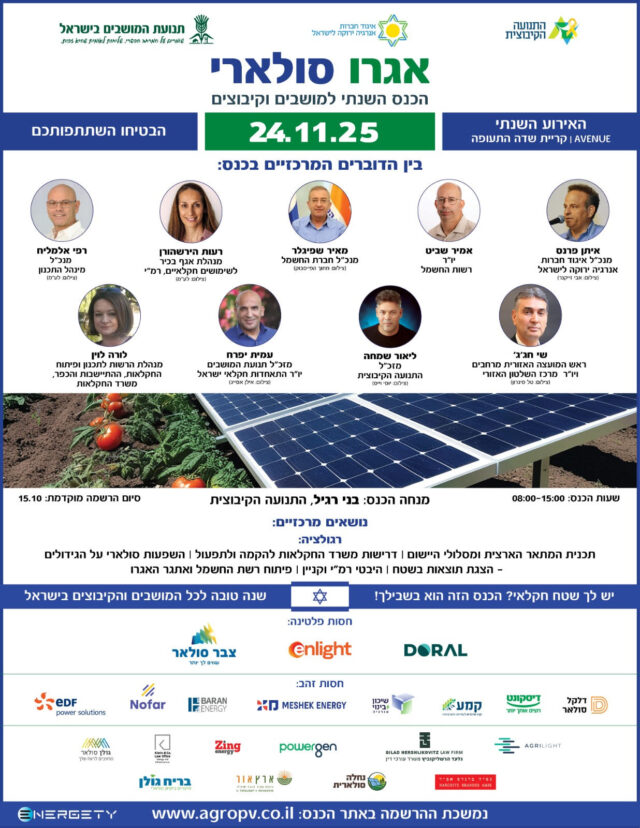 ב־24 בנובמבר יתקיים ב־AVENUE שבקריית שדה התעופה הכנס השנתי למושבים ולקיבוצים – אגרו סולארי, אשר צפוי להיות אחד האירועים המרכזיים של השנה בתחום השילוב בין חקלאות לאנרגיה מתחדשת. הכנס יפגיש בין מקבלי החלטות, חקלאים, מנהלי משקים ובעלי קרקעות, ויציע מבט אל עתיד שבו החקלאות מייצרת לא רק מזון – אלא גם חשמל נקי.