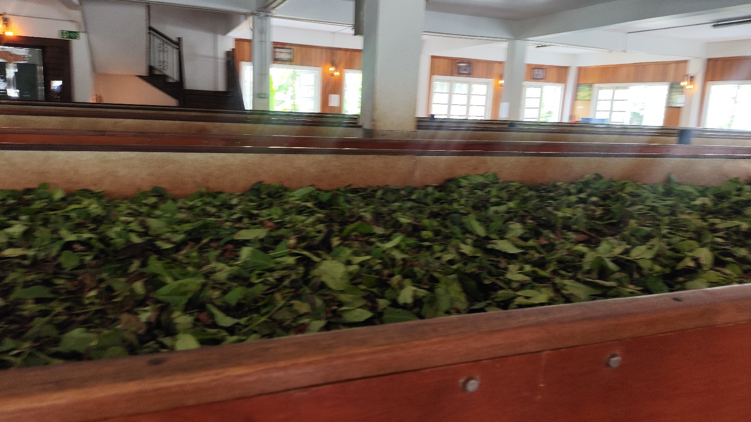 כפי שרואים בתמונות 3 ו-5, העלים הטריים נפרשים בתעלות עץ ארוכות ומאווררות. אוויר חם או קר עובר דרכם — תלוי באקלים ובסוג התה — למשך 12–20 שעות.